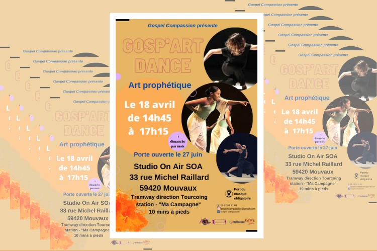 Les ateliers se déroulent du 25 octobre 2020 au 27 juin 2021 (une session par mois). Inscription via ce lien : https://www.helloasso.com/associations/gospel-compassion/evenements/gosp-art-dance-atelier-mensuel-de-danse-liturgique-et-prophetique