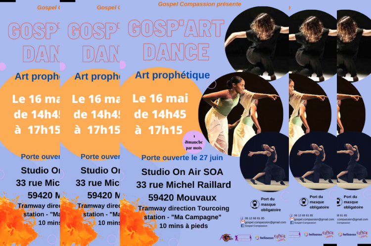 Les ateliers se déroulent du 25 octobre 2020 au 27 juin 2021 (une session par mois). Inscription via ce lien : https://www.helloasso.com/associations/gospel-compassion/evenements/gosp-art-dance-atelier-mensuel-de-danse-liturgique-et-prophetique