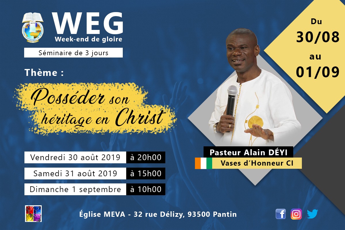 Du 30 août au 1 septembre nous recevons pour notre week-end de gloire de septembre le pasteur Alain DEYI venant de l’église Vases d’Honneur Yopougon (Abidjan) !